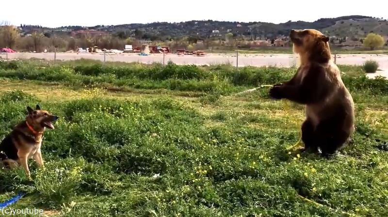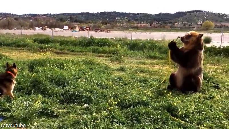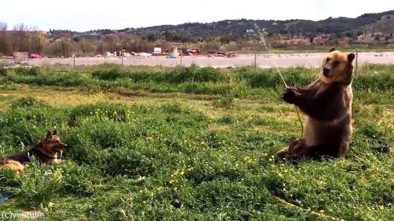 水遊びを楽しむクマと犬…とっても仲良し(動画)