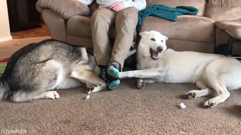 ハスキーたちにとってのベストポジションは、大好きな飼い主さんの足元。