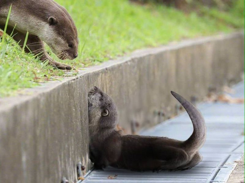 のそのそと歩く亀にキリンが興味津々…頑張って低姿勢をキープして観察する