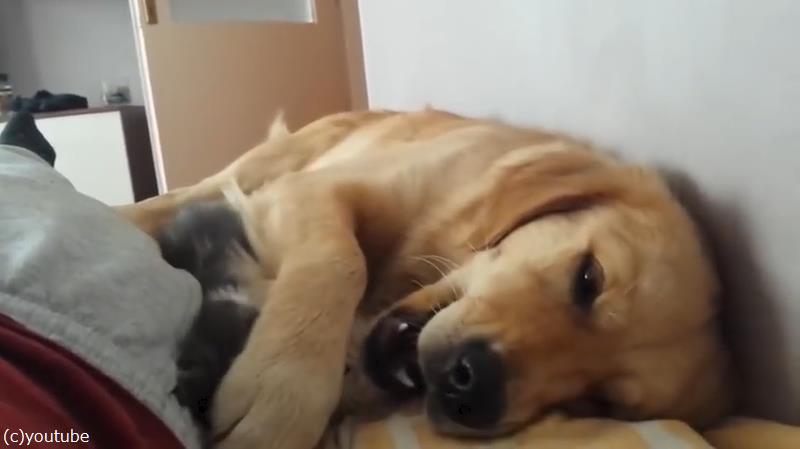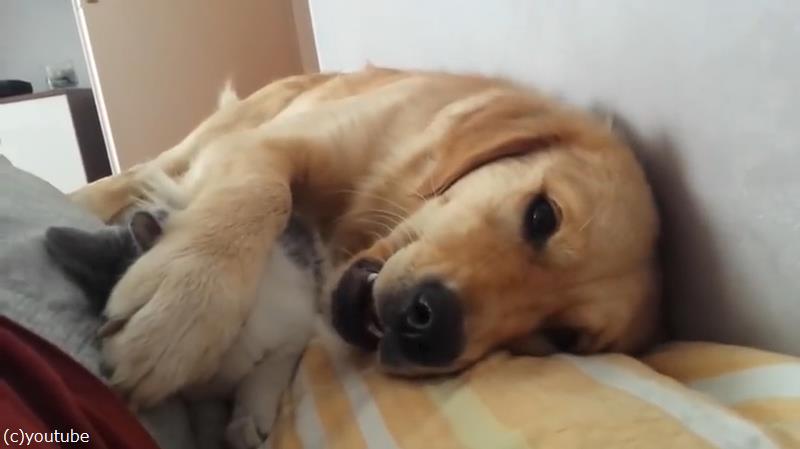ひとりで退屈な子猫は、遊び相手欲しさにお休み中の犬の口元にかぶりつきますが……。