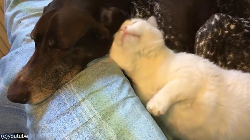 「すきすきーっ!」と頭をこすり付けて甘える猫とは対照的に、犬の方はいたってクールです。かといって、嫌がっているわけでもなさそう。