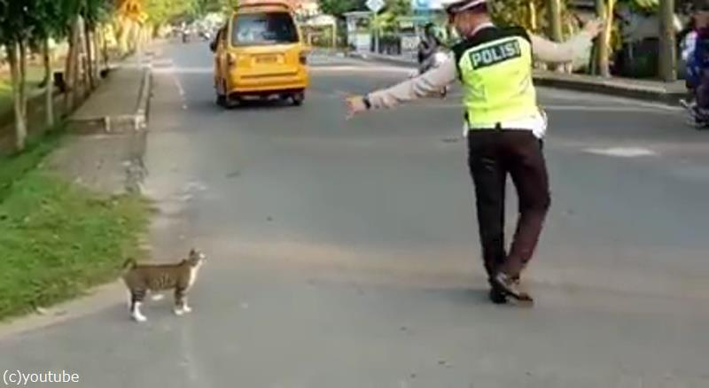 警官の誘導がなければ、猫がうっかり車やバイクの前に飛び出してしまう……なんてこともあったかもしれません。