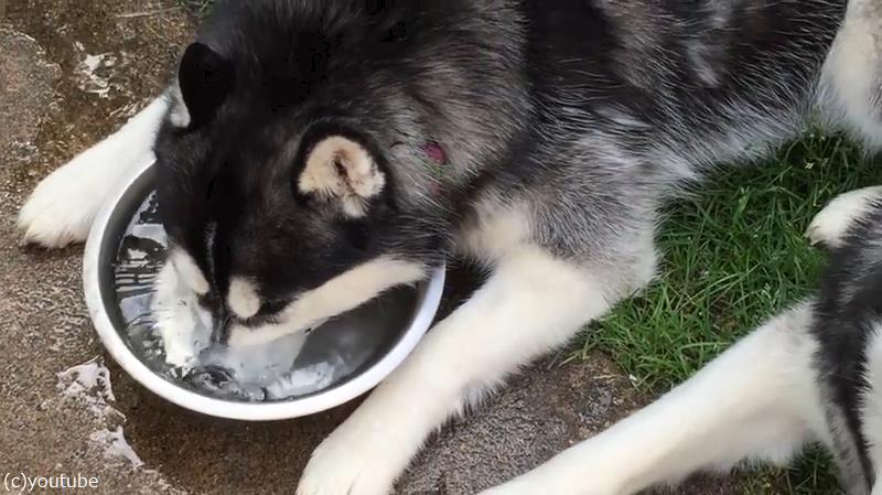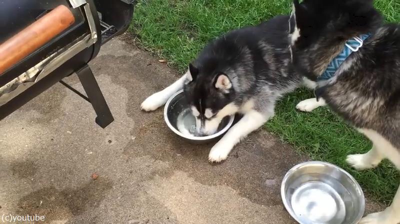 隣の犬も同じようにお水を前にしているものの、遊んでいるのはマヤちゃんだけ。