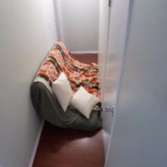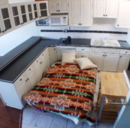 ↑ベッド備え付けのアパートに、ルームメイトが自分のベッドを持ってきた。そこで彼のベッドをリビングに置いた。