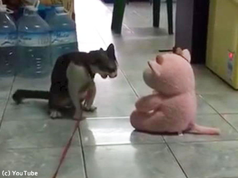 ぬいぐるみに戦いを挑んだ猫…見事なワザを決める(動画)