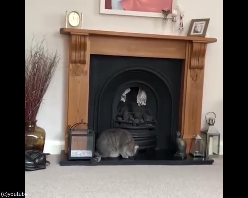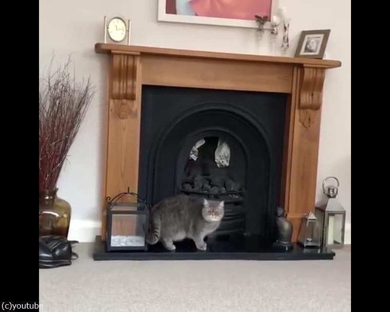 暖炉に登ろうとした猫「しまったあああ!?」(動画)