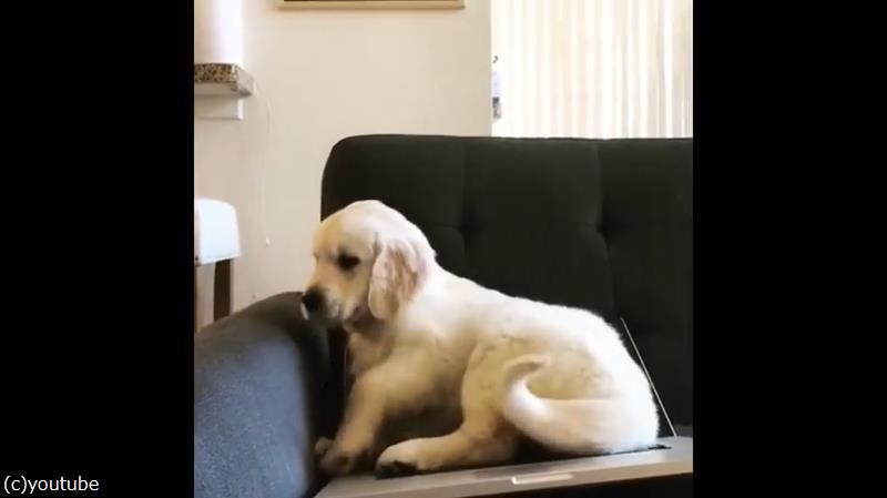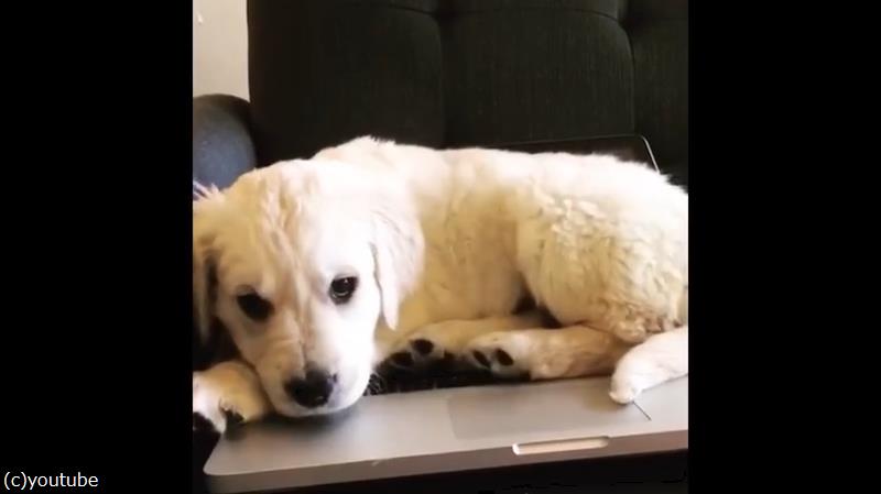 飼い主さんのノートパソコンの上に、堂々とのぼってくる子犬。