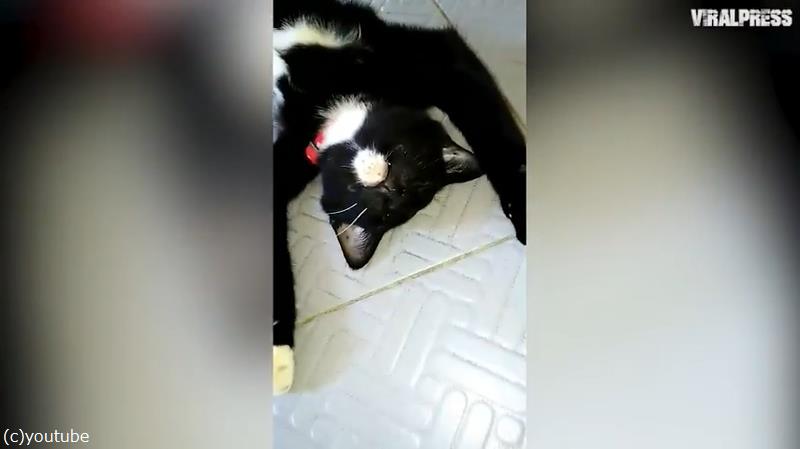 絶対にごはんを独占したい子猫…体を張って鉄壁ガード(動画)