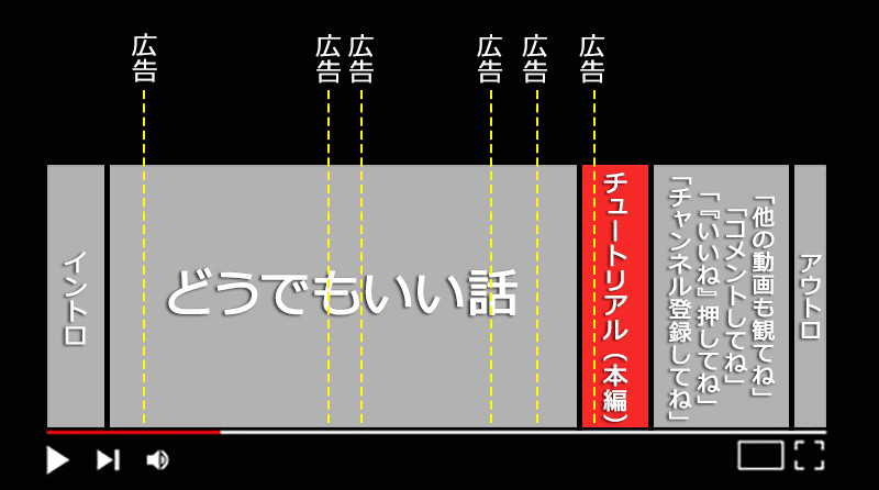 「今どきのYoutubeのチュートリアルは、だいたいこんな作りになっている……」と、1枚の図で説明されていました。