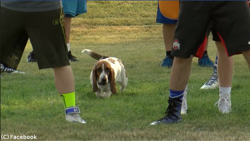 練習に励む選手たちの中で、ひとりリラックスするバセット・ハウンド。