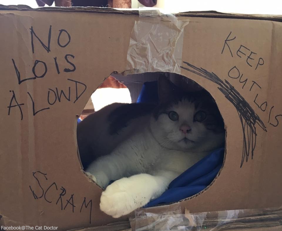 箱の落書きを見るからに、ロイスという仲間の猫は、この中に入れさせてもらえないようです。