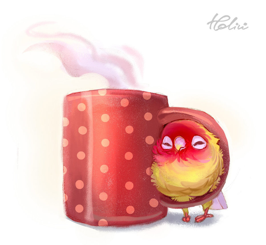 マグから伝わるほのかな暖かさも手伝ってか、うとうとするインコ。
