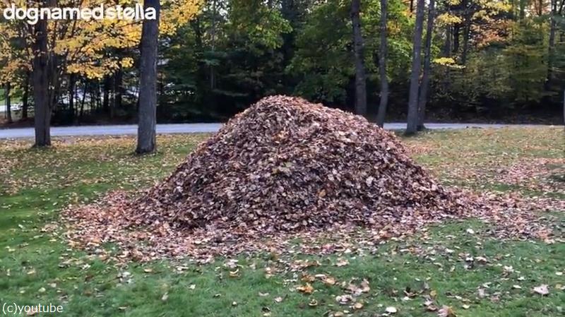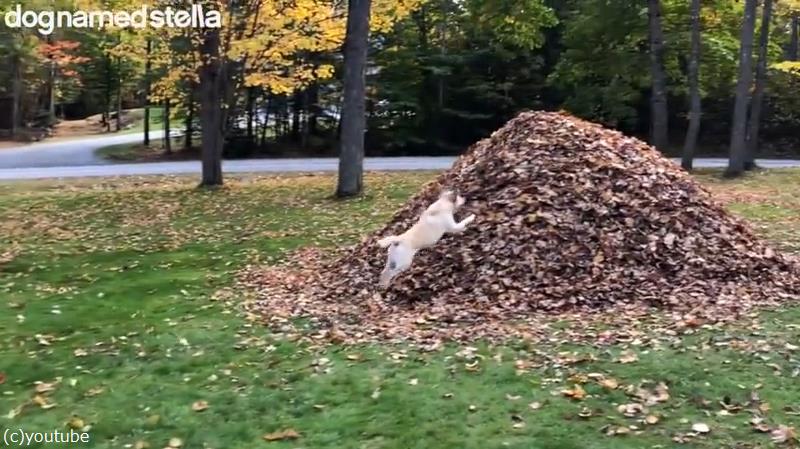 秋になると、こうして落ち葉の山で遊んでいるというステラちゃん。どれだけ楽しいかは、この尻尾の振り具合から伝わってきますね。