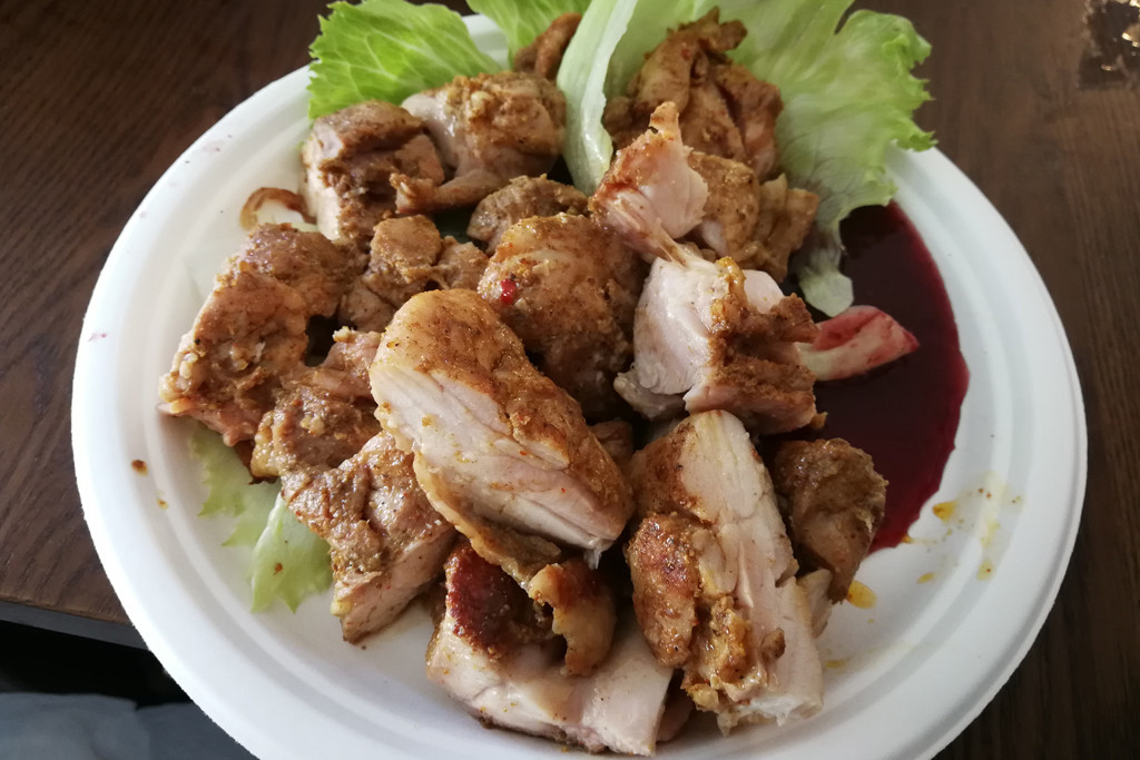 ジョージアのスパイスとフレーバーオイルに一晩漬けてグリルしたチキンは、ボリュームたっぷりでジューシーな味わい。甘酸っぱいコケモモ(リンゴンベリー)のソースがかかっています。