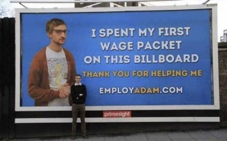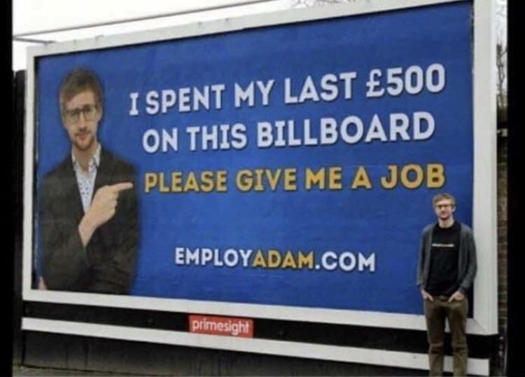 なんと、手持ちのお金を全額投じて広告看板を借り、求職中であることをアピールしたのです。