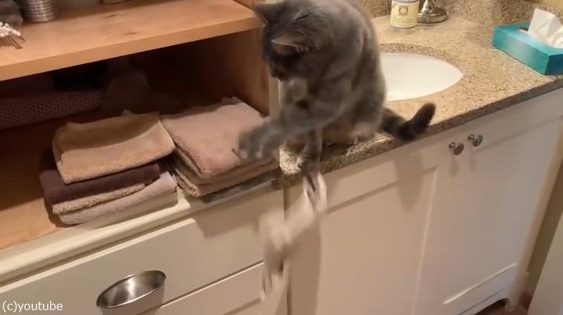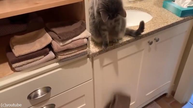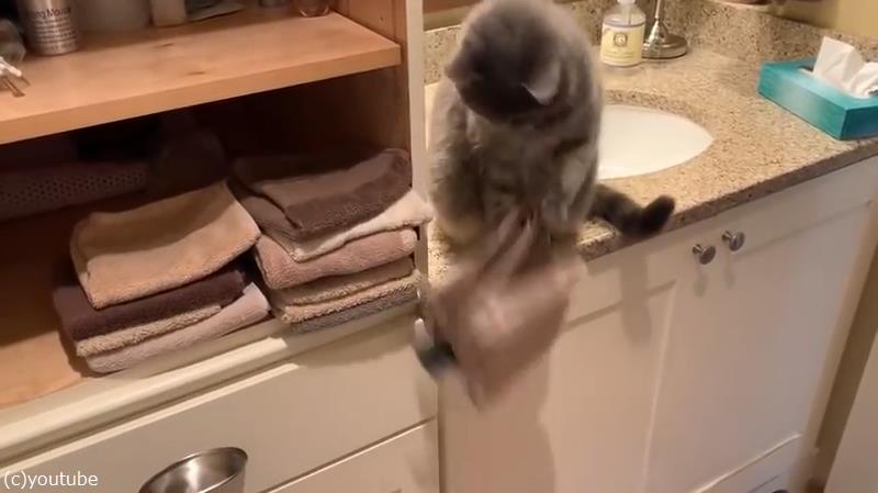 Cat Throws Stack of Hand Towels on the Floor - YouTube