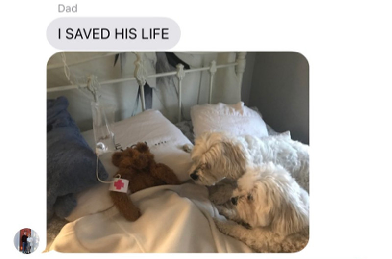 そして最後は、ベッドで休みながら点滴を受けるぬいぐるみの姿を送信。父親の愛情たっぷりの看病のおかげでぬいぐるみは一命を取りとめ、無事持ち主のもとへと戻ったのでした。