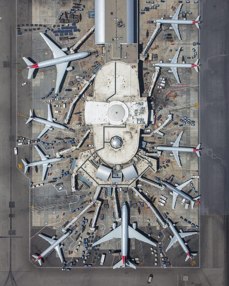 地上からであれば、いろいろなサイズの飛行機がターミナルのまわりに駐機しているよくある光景だと思うのですが、上から見ると印象が大きく変わりますね。