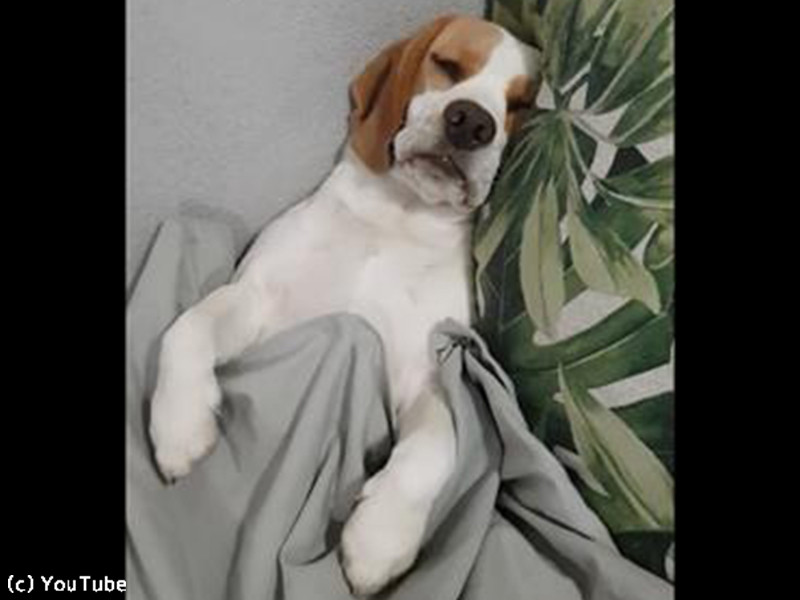 ブランケットをかけられて、気持ちよさそうに眠るビーグルのBellaちゃん。