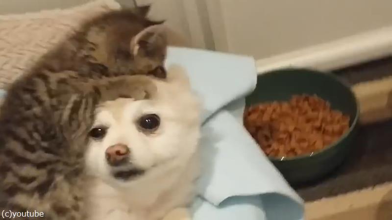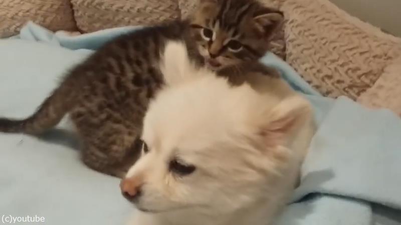 無邪気な子猫の遊びに(仕方なく)付き合うポメラニアン(動画)