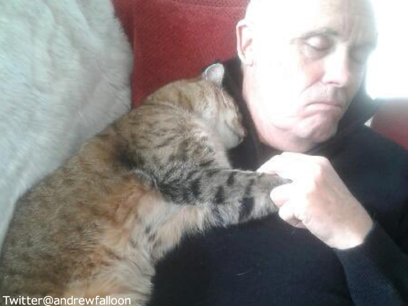 ある日、母親がドアを少し開けたまま外出したところ、いつの間にか見知らぬ猫が家の中に入ってきて、このように父親に寄り添っていたのだとか!