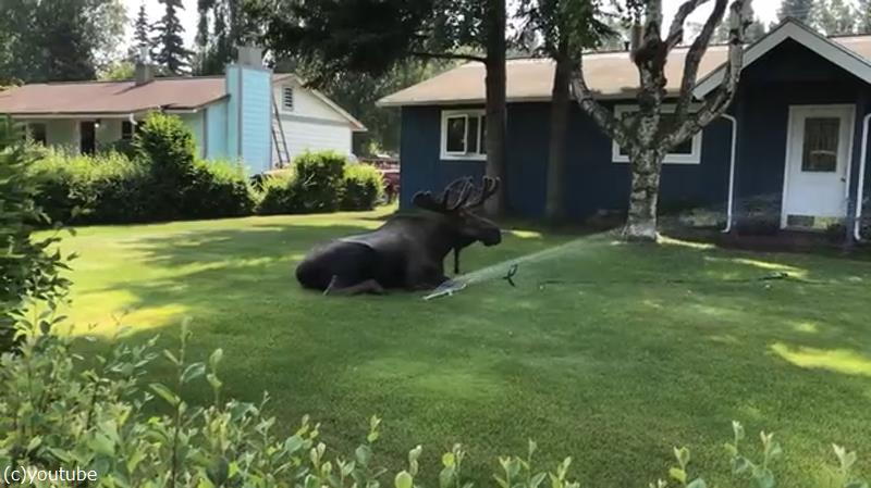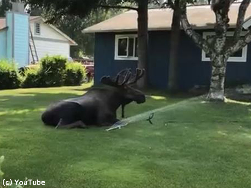 アラスカが暑すぎて…ヘラジカが庭のスプリンクラーで水浴びしてた(動画)
