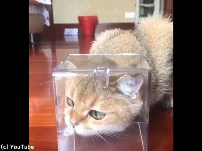 透明な箱にお顔を突っ込むニャンコ。視線の先には、小さな白い蝶々が!