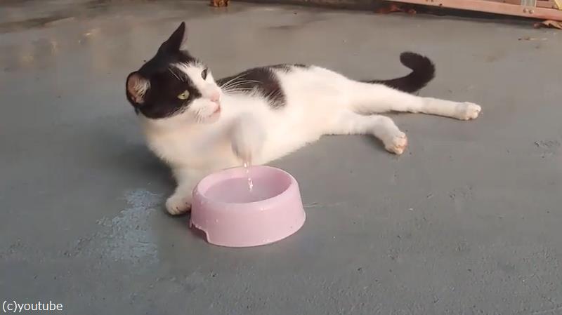 体が濡れるのを嫌がる猫は多いですが、中にはこんな方法で水を飲む子もいるのですね。