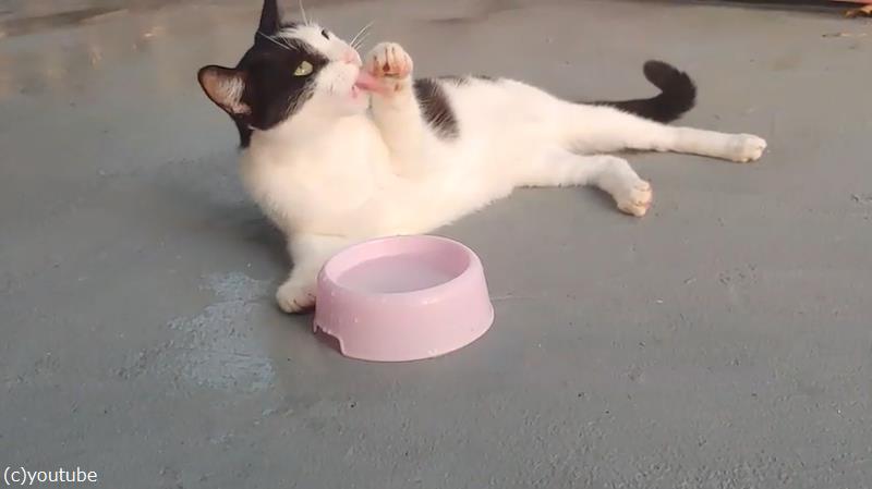 横たわる猫の…ユニークなお水の飲み方(動画)