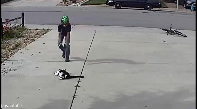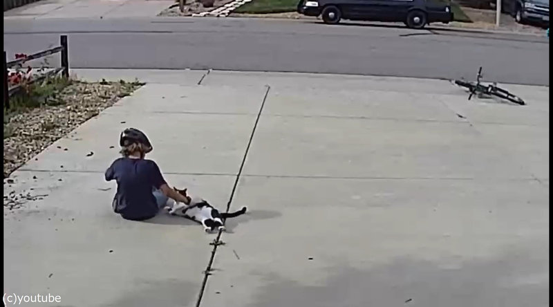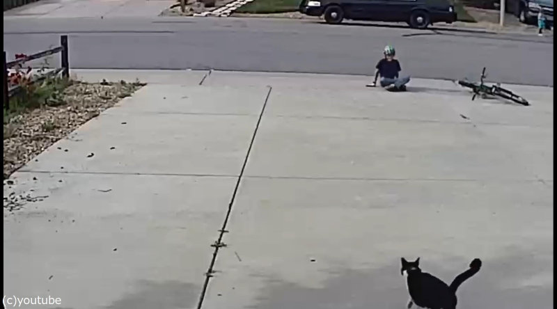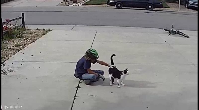 少年が自転車を降りて地べたに座り込むと、猫のほうから近づいてきました。