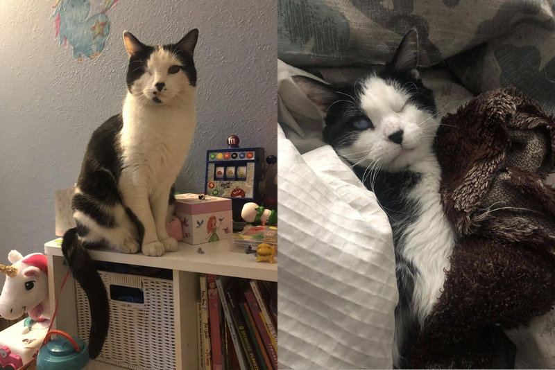 2匹とも野良で子猫のときに引き取り、感染症のため片目だった。リムジーは部分的に盲目だけどスイートな性格で自分の親友でもある。