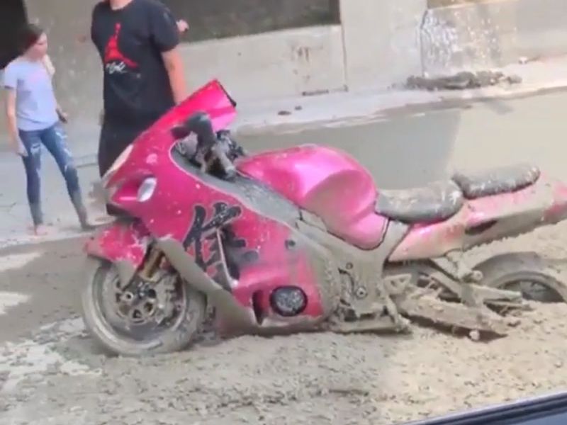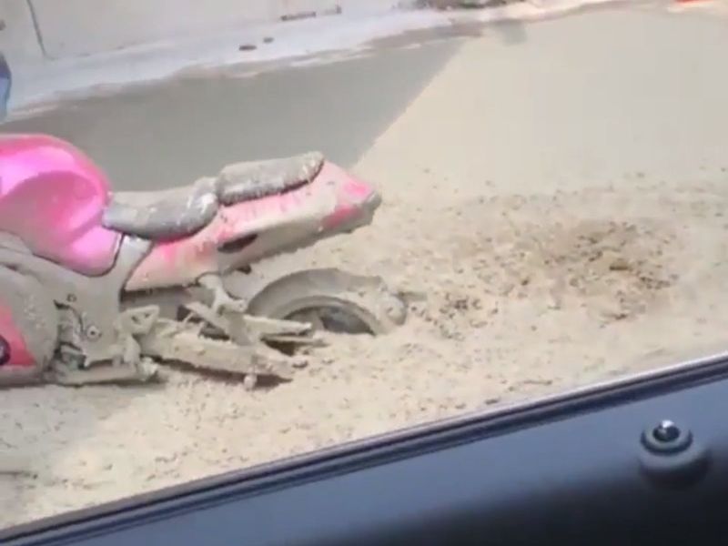●その男は手についたコンクリートを心配している場合じゃない。永久に固まってしまう前にバイクを先に救出しないと。