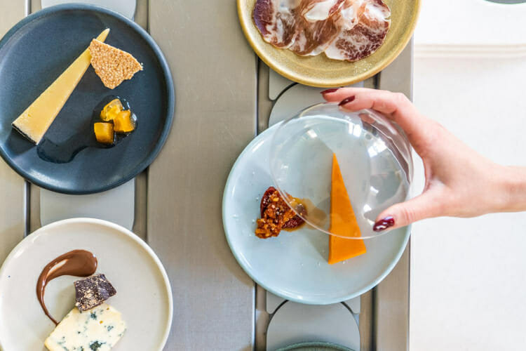 回転寿司と同様に、ベルトコンベアに乗ったチーズ料理の小皿が運ばれてくるとのことです。