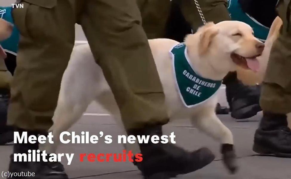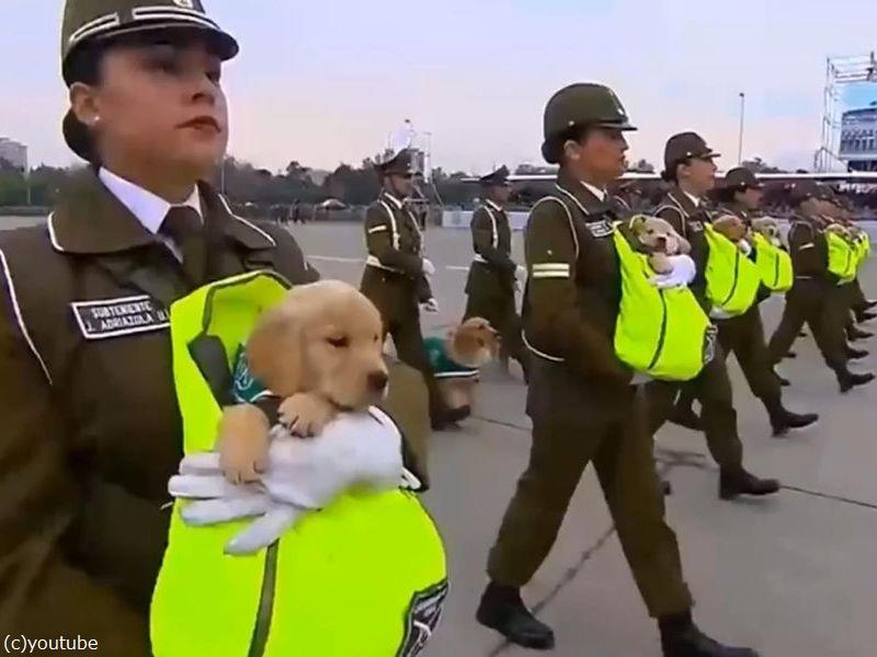 警察犬の赤ちゃんたちが抱っこされながらチリの軍事パレードに参加