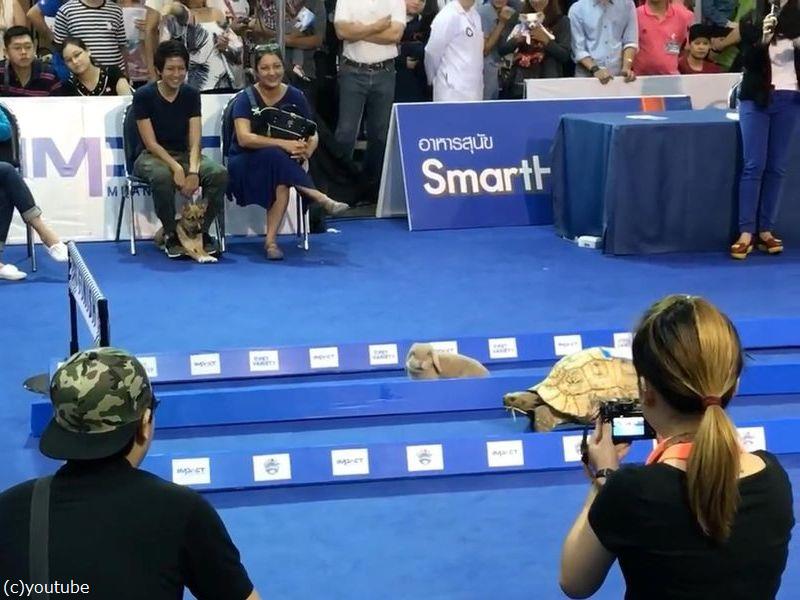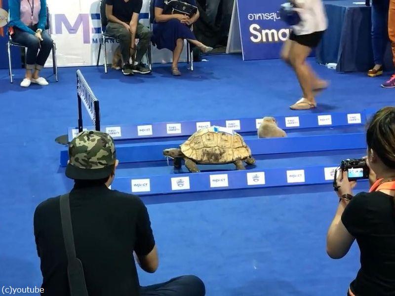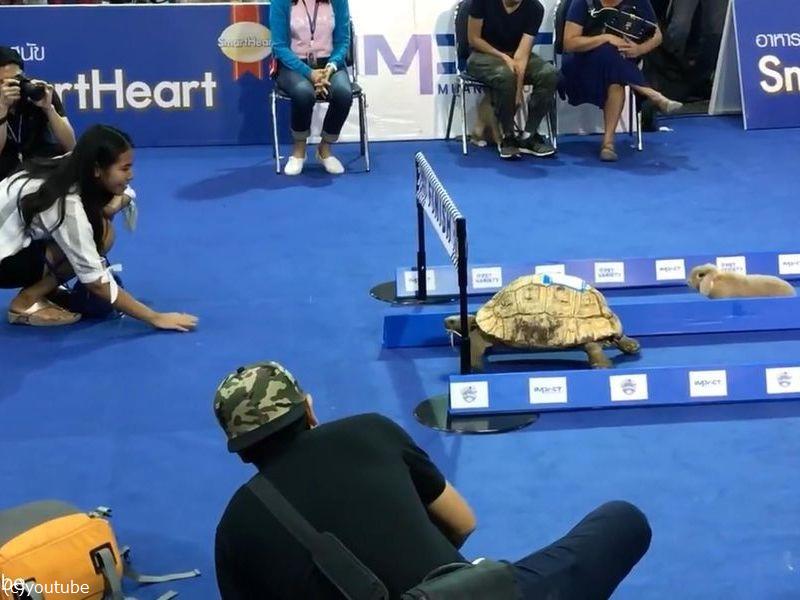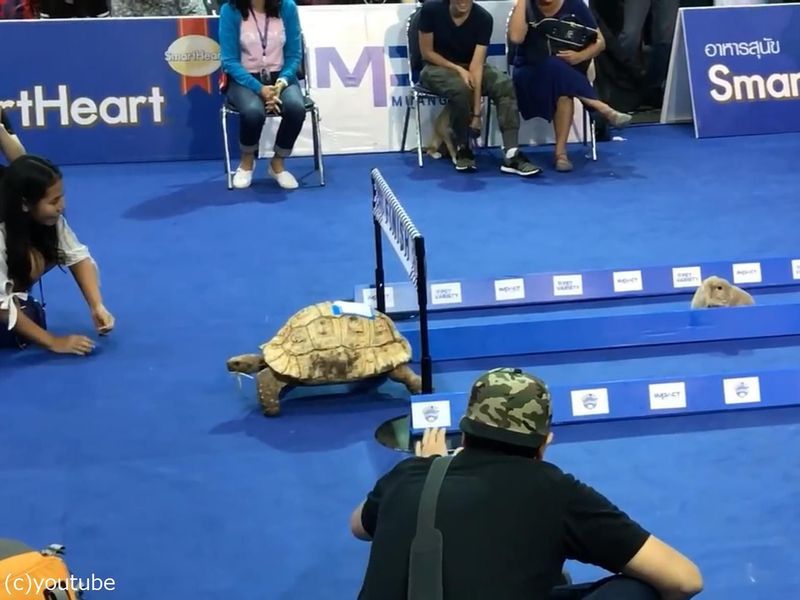 足の速いウサギとのろまなカメが競走して、ウサギが油断している間にカメが勝つという教訓ですが、実際にウサギとカメを競走させるイベントがありました。