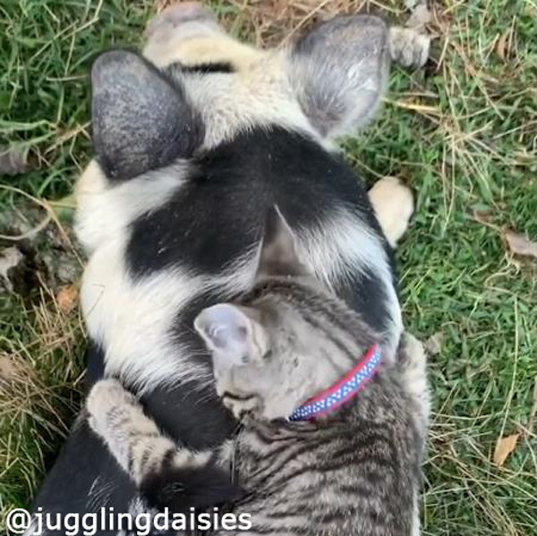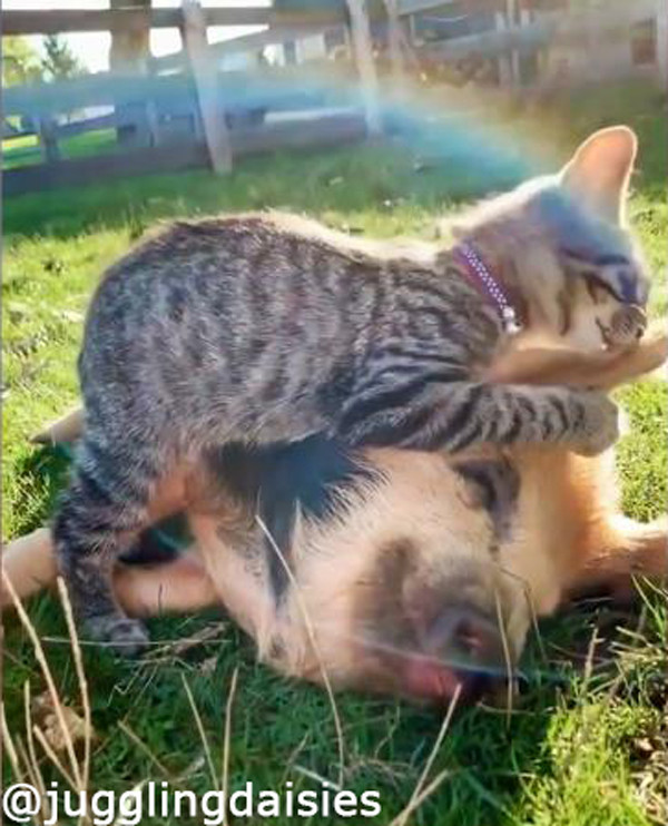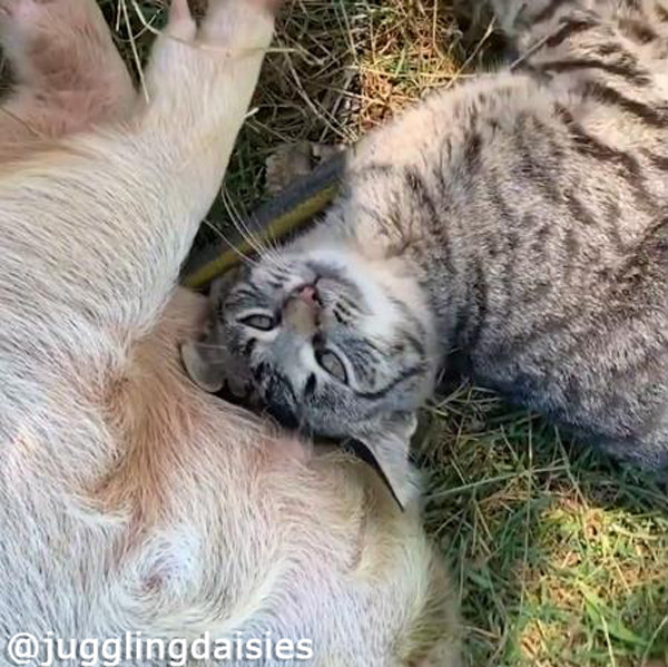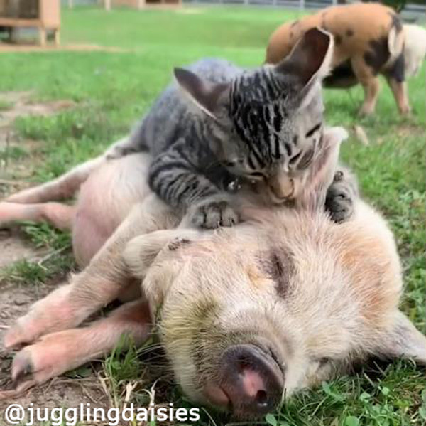 うらやましいほどラブラブ…ブタをこよなく愛する猫(動画)