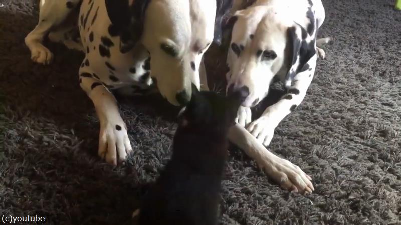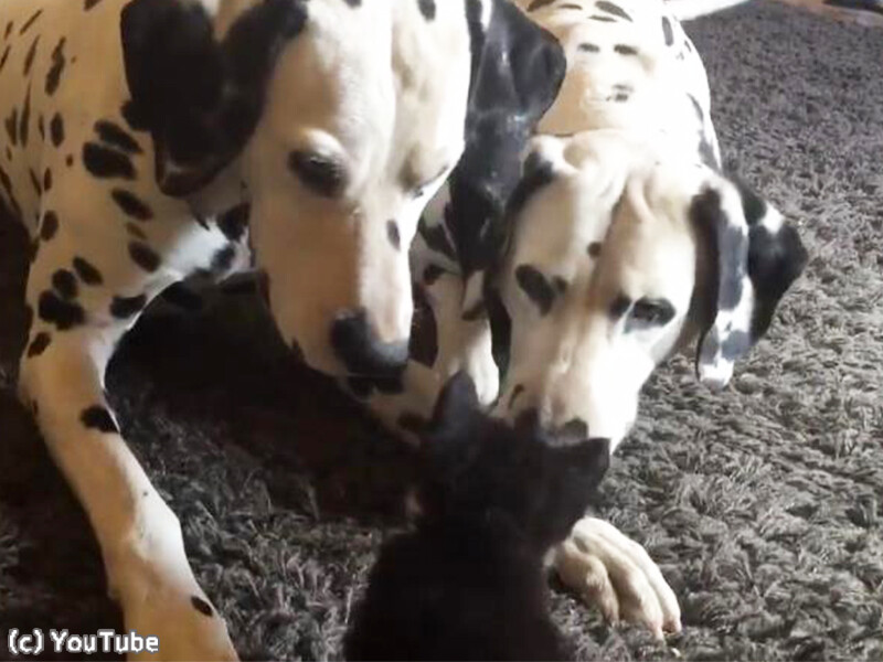 子猫の見つめる先は…面倒見のいいダルメシアン2匹(動画)