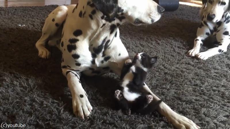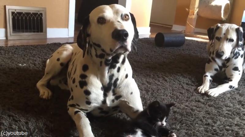 元気に遊ぶ子猫を、ダルメシアンたちが終始優しく見守っていました。
