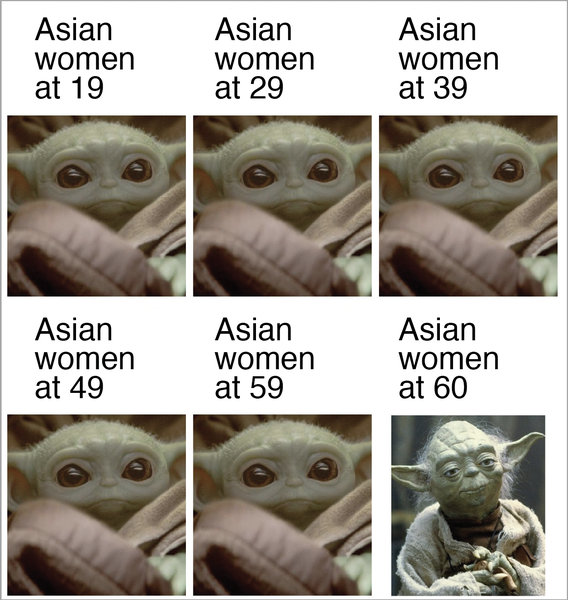 50歳の白人はお年寄り感があり、50歳の黒人は幼く見えることを、ヨーダを例にして比較されていました。