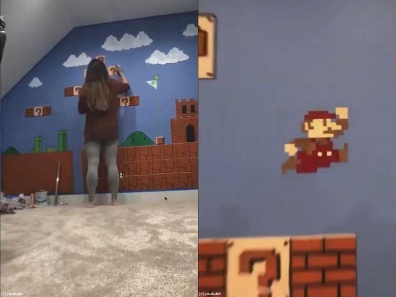 海外のお母さん「子ども部屋にスーパーマリオを手描きしてみた…」大人もうらやましくなる壁