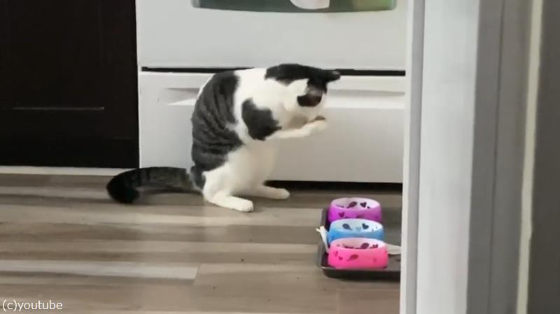 アライグマみたいにご飯を食べる猫(動画)