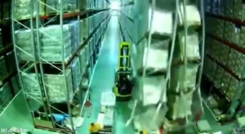 倉庫のある工場で働いていたことがあるが、通常フォークリフトはぶつかっても全体を崩壊させるようなことはない。