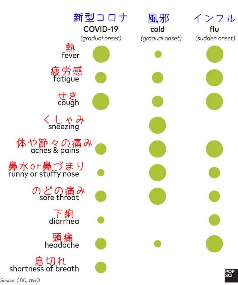 「新型コロナ、風邪、インフルエンザの自覚症状の違いをわかりやすい図にした…」海外の反応