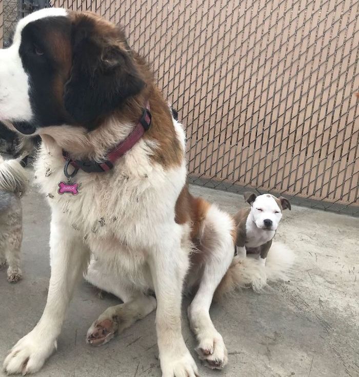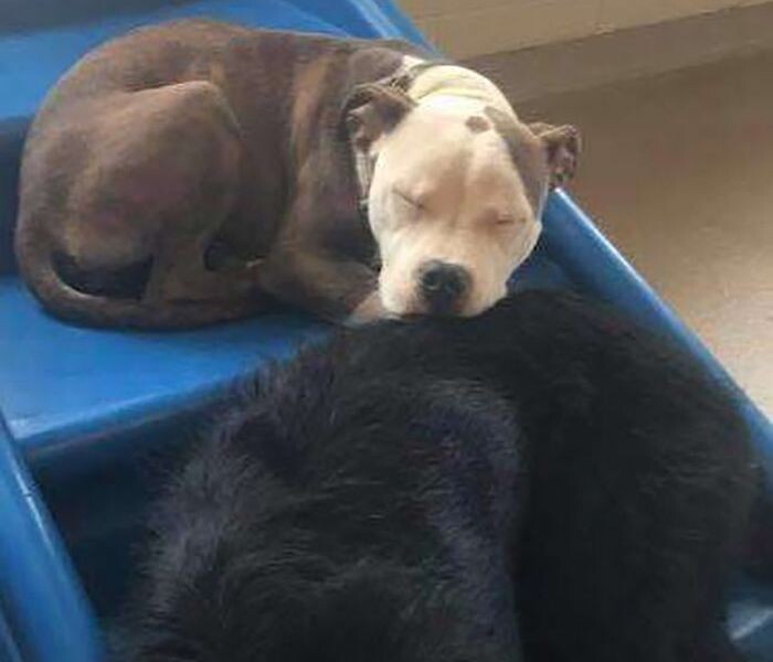 エドナの飼い主さんが引き取りに来ると、たいてい他の犬をまくらにして寝ているのだとか。