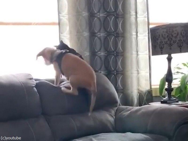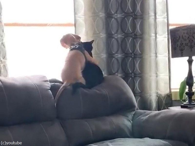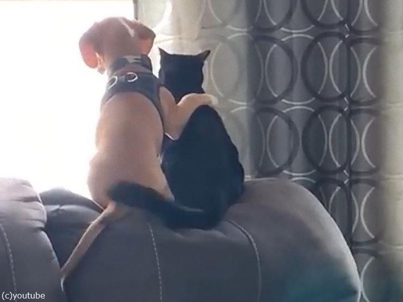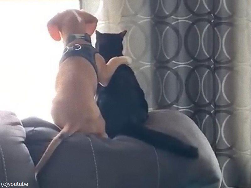 仲良しの犬と猫…犬は肩に手を掛け、猫はしっぽで愛情を示す(動画)