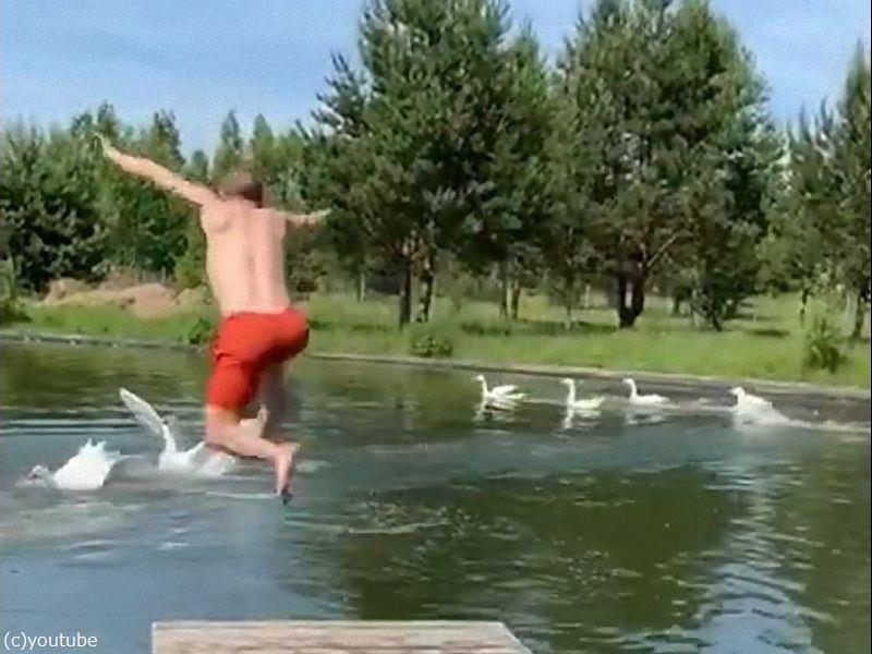 女性が湖に飛び込んだら…白鳥の群れが飛びかかってきた!(動画)