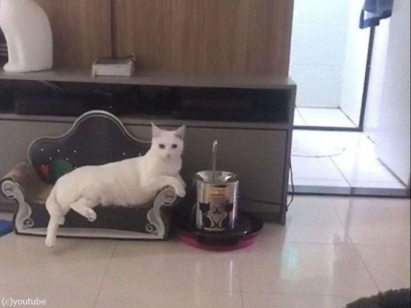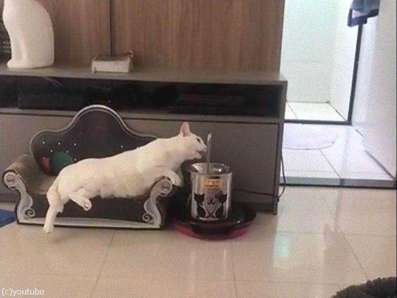 猫用のソファに寝そべりながら、優雅に噴水から水を飲む様子をご覧ください。