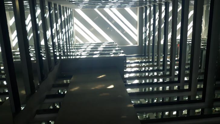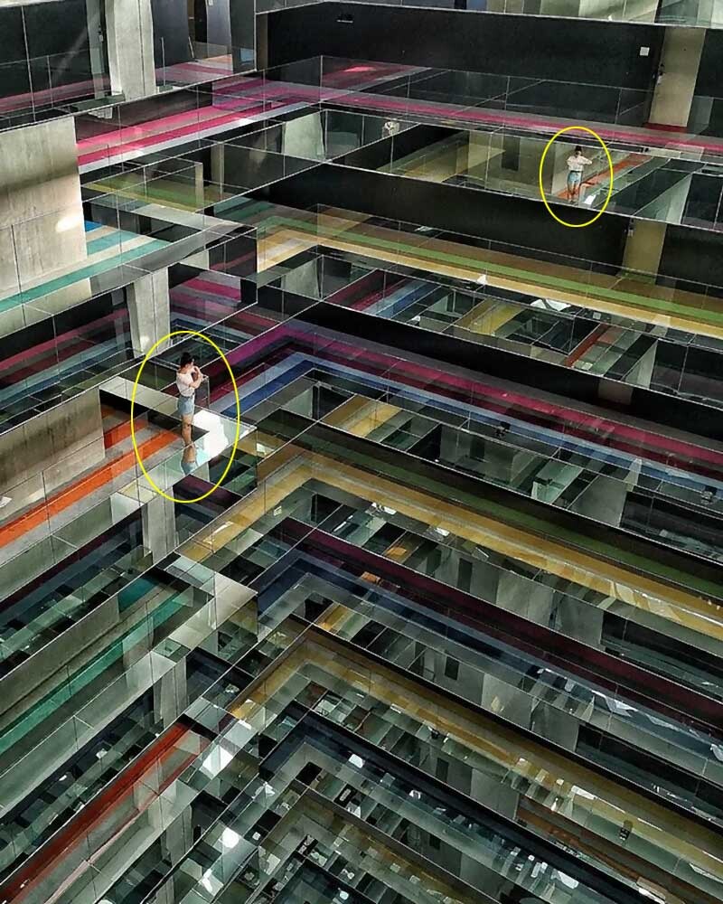 カラフルな立体パズルか迷路のように思えますが、同じ女性が2人いることから、鏡と床の色によって面白い視覚効果が生まれているようです。