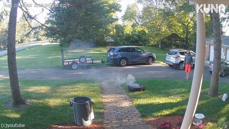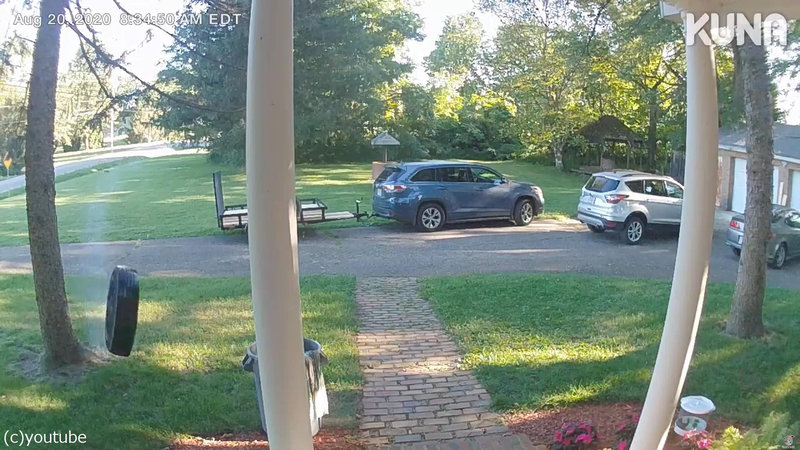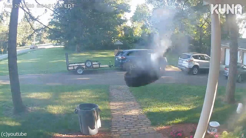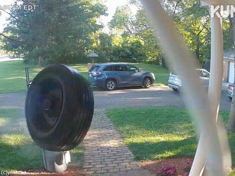 監視カメラは見ていた…時速100kmで転がってきたタイヤが玄関に衝突(動画)