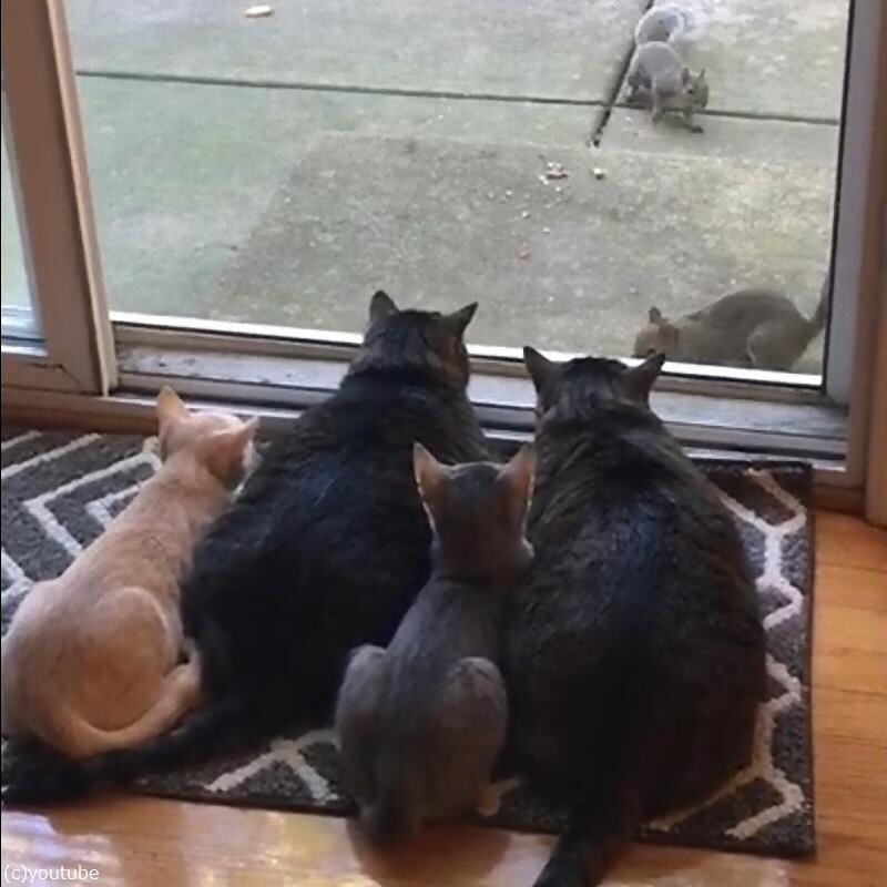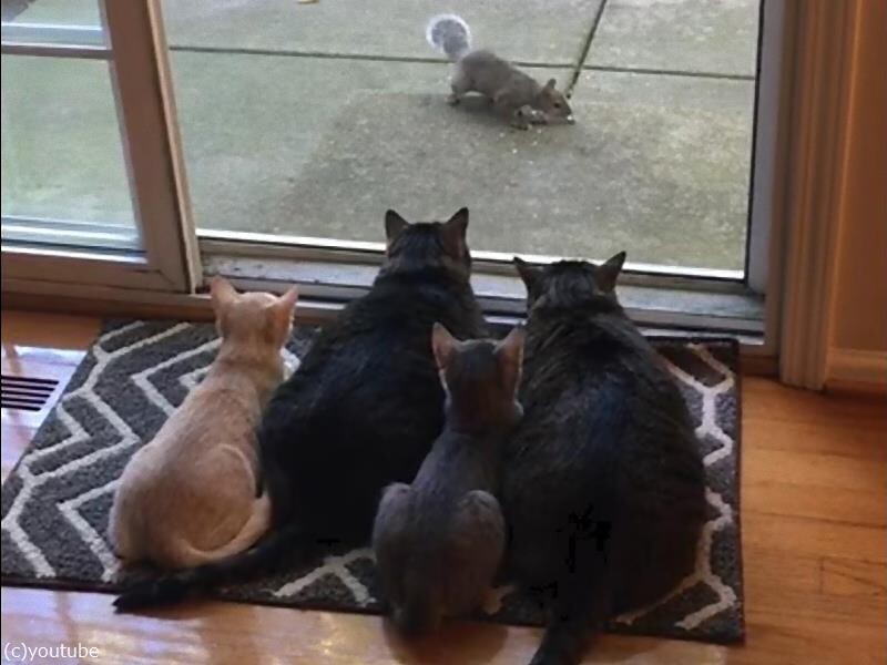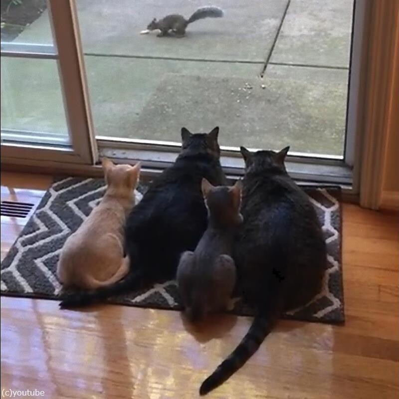 「ごくり…」リスが気になってしかたない猫ファミリー(動画)